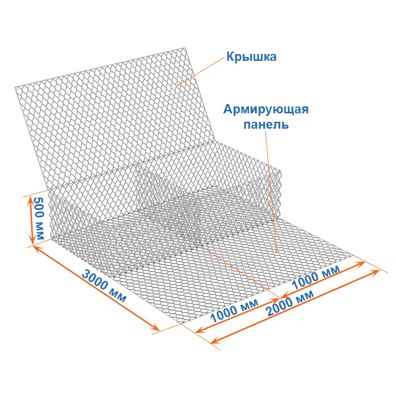 Габионы с армирующей панелью 3x2x0,5 представляют собой коробчатые габионы, нижняя сторона которых продлена и образует, так называемый, «хвост». Это и есть армопанель, которая составляет одно целое с одной из сторон конструкции.